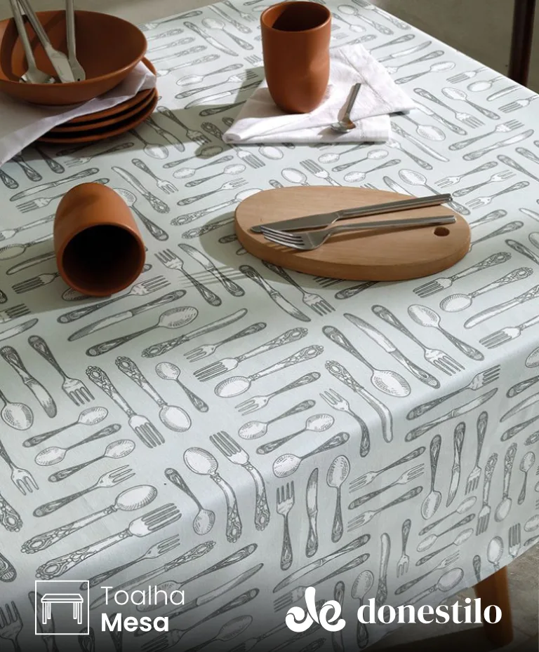 Toalha de Mesa Quadrada Döhler para 4 lugares, modelo Athenas Ellie (1,40 x 1,40 m), traz seu design moderno, com uma padronagem formada por talheres. Prática e versátil, é ideal para o dia a dia. Além disso, o produto possui o selo Döhler Clean, que adiciona uma camada protetora, facilitando a limpeza e aumentando a durabilidade da toalha. Confeccionada com 50% algodão e 50% poliéster, esta toalha tem gramatura de 170 g/m², combinando resistência e suavidade ao toque.