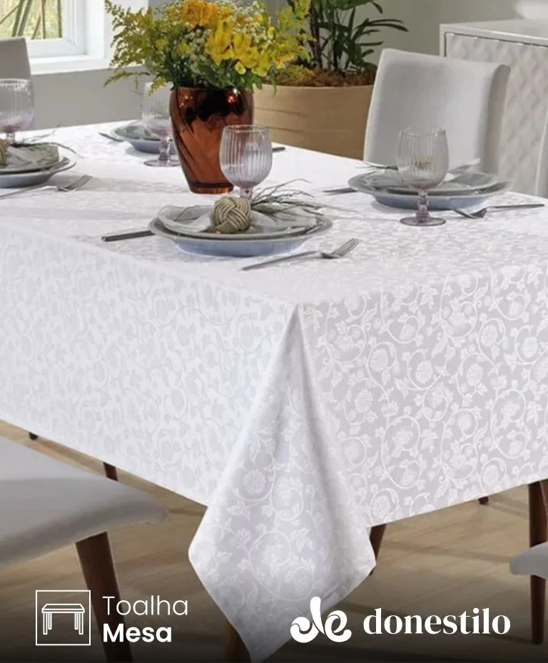A Toalha de Mesa Quadrada Döhler 4 lugares Requinte II TJ5040, elegante e funcional. Feita de 100% poliéster e tecido Jacquard, oferece durabilidade e acabamento refinado.