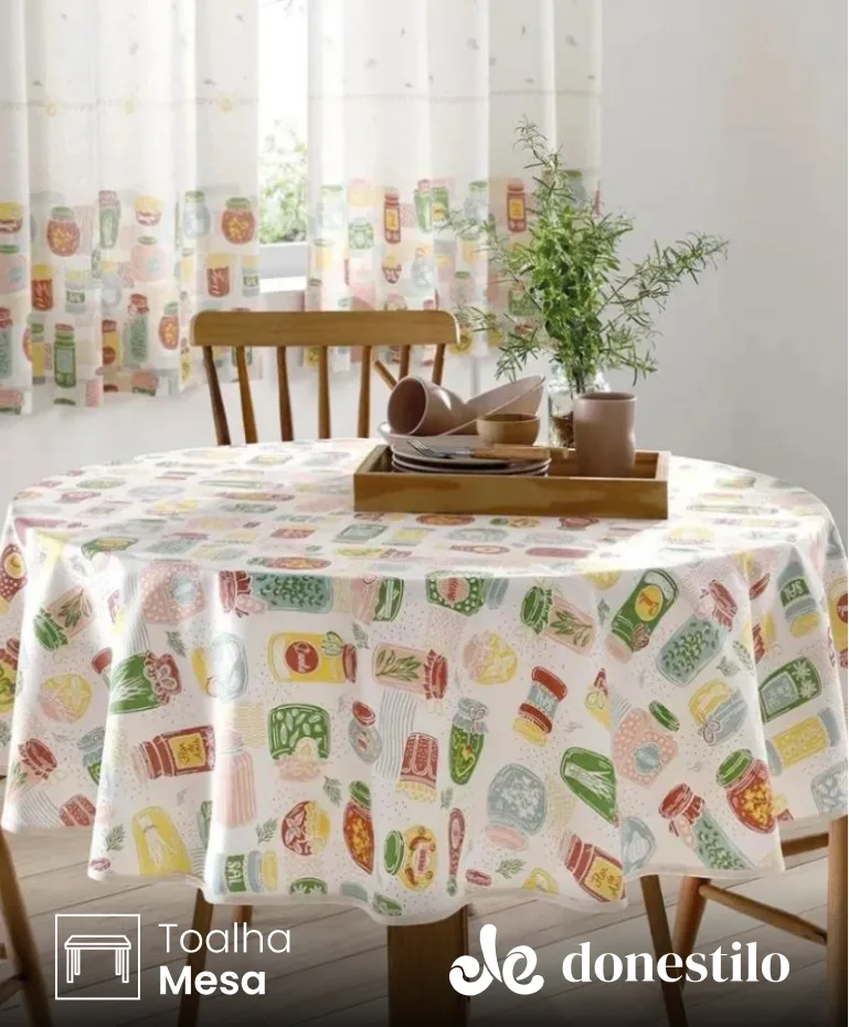 Toalha de Mesa Redonda Döhler Athenas Ester para 4 lugares. Moderna, com uma estampa alegre, atemporal e tecnologia Döhler Clean, é fácil de limpar e durável. Confeccionada em 50% algodão e 50% poliéster, com gramatura de 170 g/m².