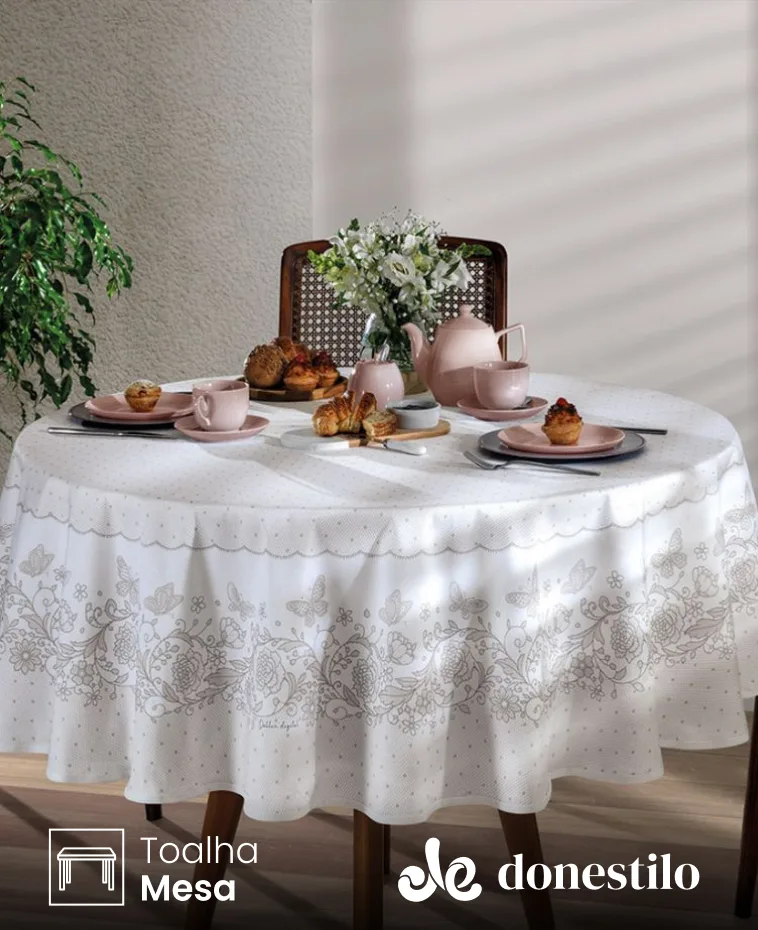 Toalha de Mesa Redonda Döhler, 6 a 8 lugares, modelo Renova Aurora (1,80 m). Sua estampa é super delicada em tom de bege com flores e borboletas, transmite calor e aconchego. Com tecnologia de estamparia digital, sua fabricação é mais sustentável, e os desenhos apresentam uma riqueza de detalhes e alta qualidade. Além disso, o produto possui o selo Döhler Clean, que adiciona uma camada protetora, facilitando a limpeza e aumentando a durabilidade da toalha. Confeccionada com 50% algodão e 50% poliéster, esta toalha tem gramatura de 170 g/m², combinando resistência e suavidade ao toque.
