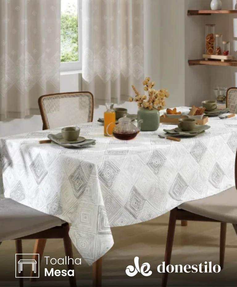Toalha de Mesa Retangular Döhler para 8 lugares, modelo Athenas Martin (1,60 x 2,50 m), traz seu design moderno, oferecendo leveza e sofisticação à sua cozinha. Com tecnologia de estamparia digital, sua fabricação é mais sustentável, e os desenhos apresentam uma riqueza de detalhes e alta qualidade. Além disso, o produto possui o selo Döhler Clean, que adiciona uma camada protetora, facilitando a limpeza e aumentando a durabilidade da toalha. Confeccionada com 50% algodão e 50% poliéster, esta toalha tem gramatura de 170 g/m², combinando resistência e suavidade ao toque.