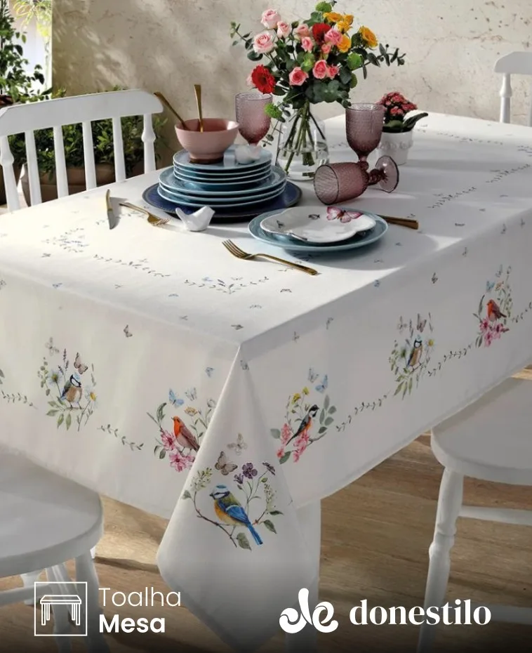 Com 1,60 x 2,70 m para 8 lugares, com estampa digital de passarinhos, proteção Döhler Clean e tecido durável 50% algodão/50% poliéster.
