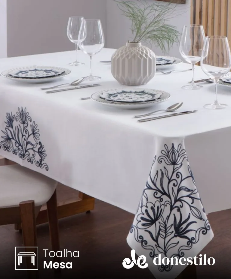 Seu estilo romântico e os detalhes bordados com um delicado desenho floral azul acrescentam um toque de elegância ao ambiente. A mistura de suavidade e requinte faz dessa toalha uma excelente escolha para quem valoriza uma decoração com classe, sem abrir mão da praticidade. Ela transforma qualquer refeição em um momento mais especial!